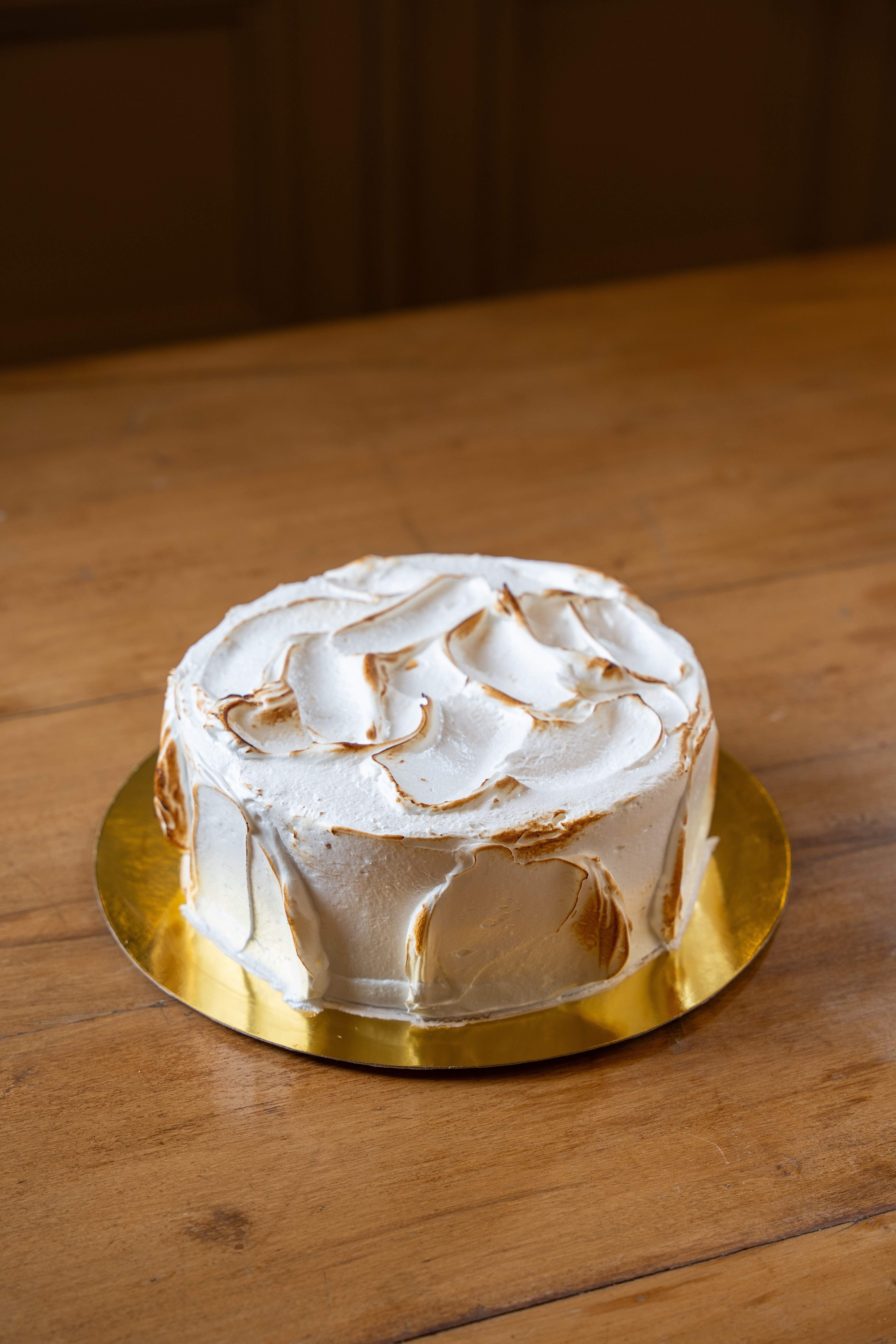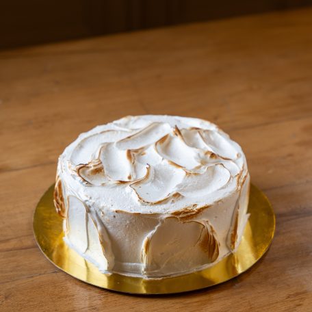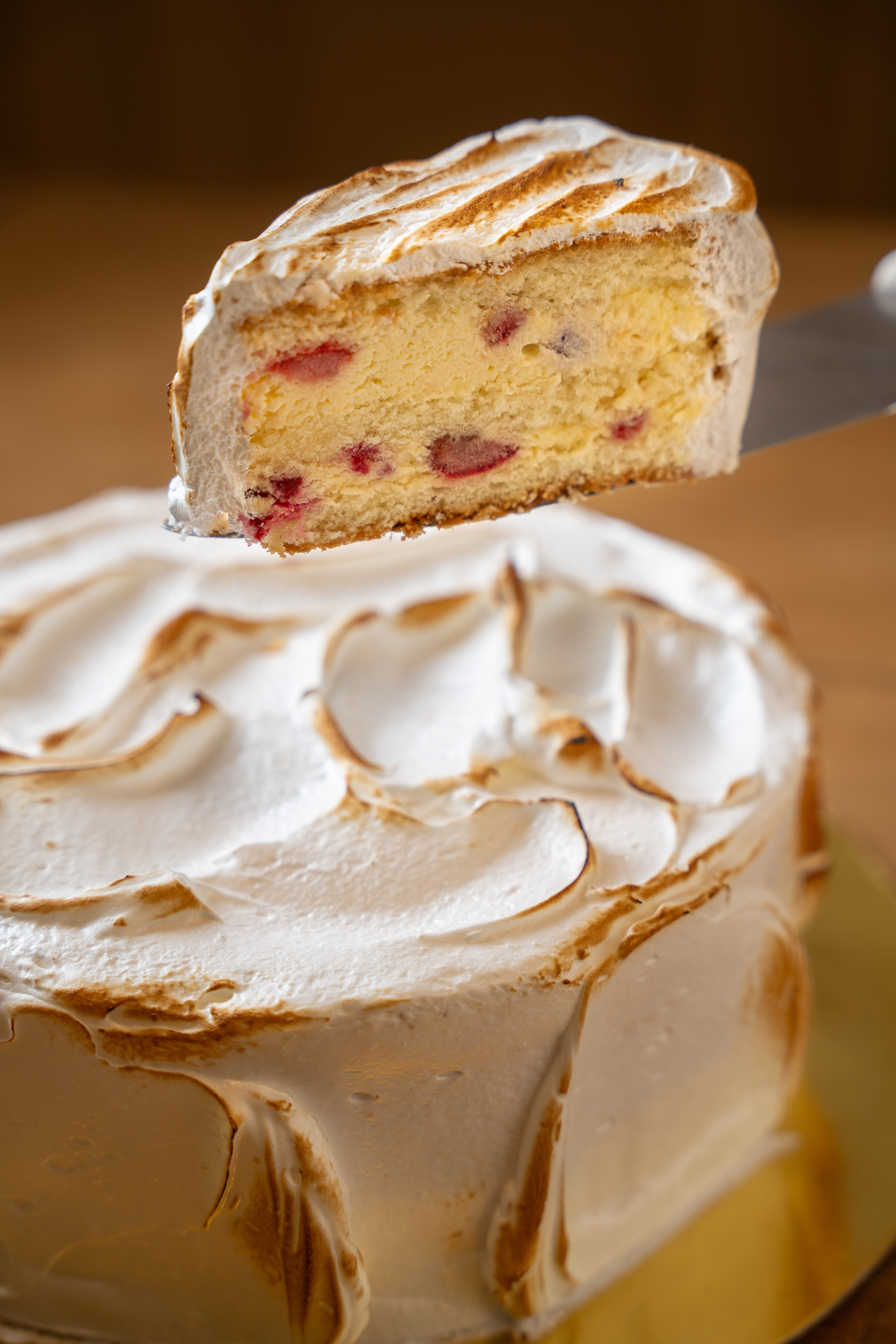 Genoise de Limon rellena con curd de limon y frutos rojos. Cubierta con merengue italiano.