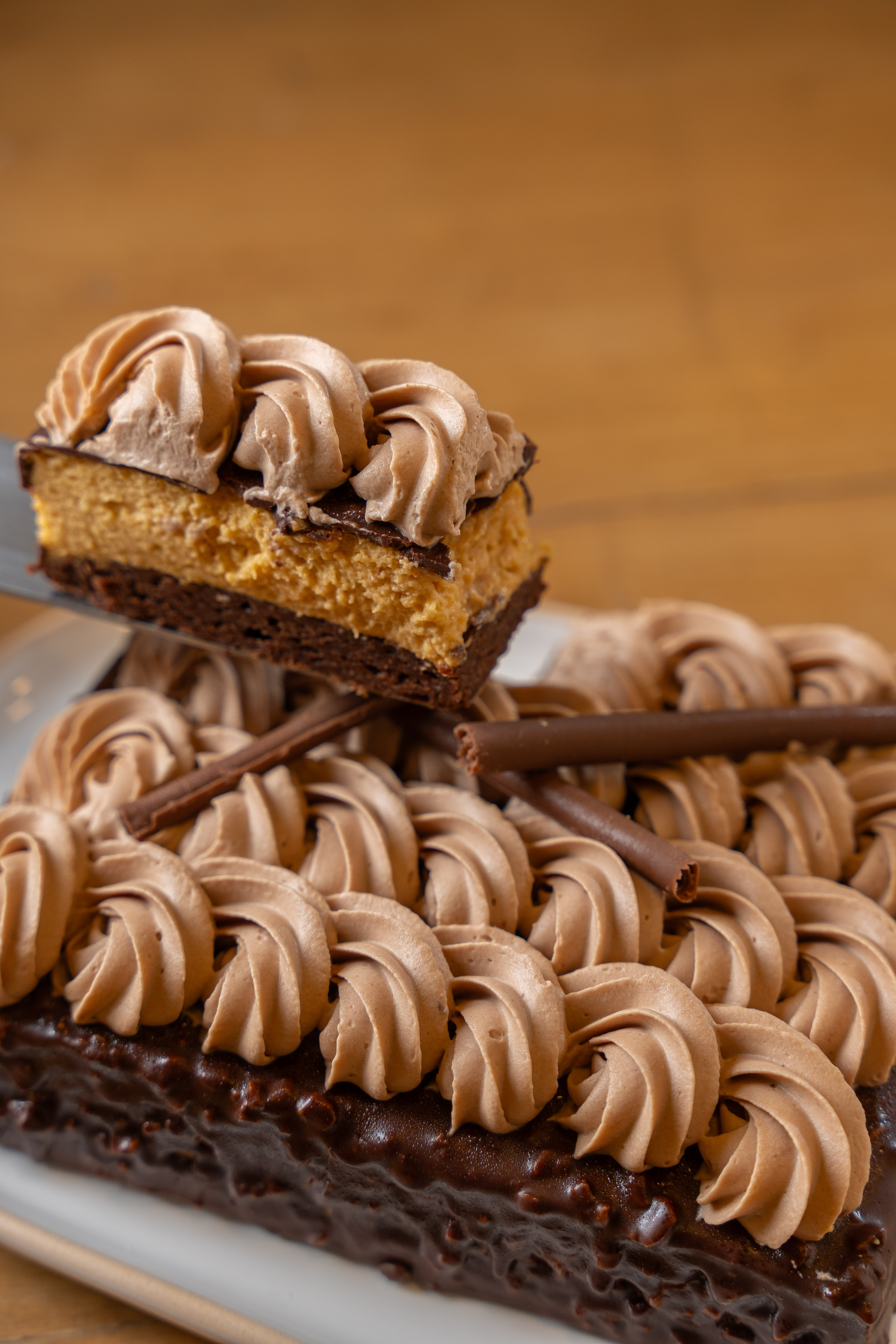 Brownie bien húmedo, mousse de chocolate, mousse de dulce de leche y merengue italiano